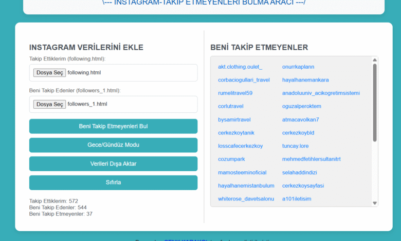 Bu araç, Instagram hesabınızdan indirilen “Takip Ettikleriniz” ve “Takipçileriniz” verilerini analiz ederek, sizi takip etmeyen kişileri listeler. Web tabanlı ve çevrimdışı çalışan yapısı sayesinde, herhangi bir program indirmenize gerek kalmadan sadece tarayıcınız üzerinden kullanabilirsiniz.